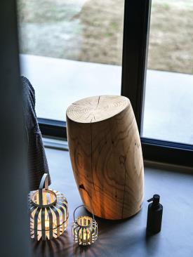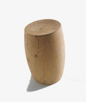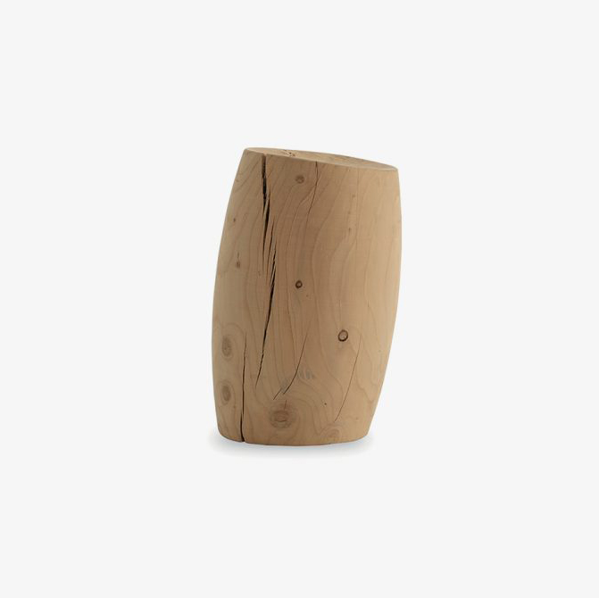 Tabouret fabriqué à partir d'un seul bloc de cèdre massif odoriférant, caractérisé par une assise légèrement concave pour un meilleur confort.