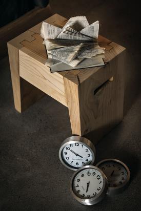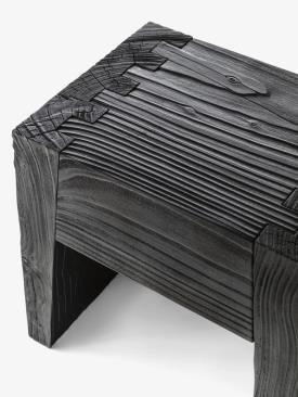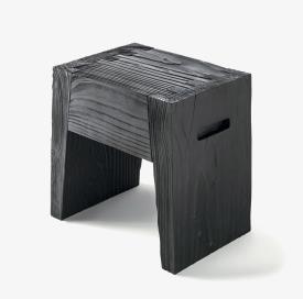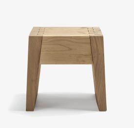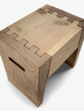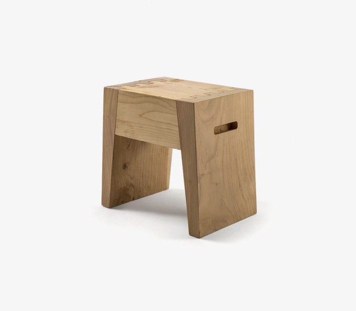 Tabouret fabriqué à partir d'un seul bloc de cèdre massif odoriférant, caractérisé par des gorges latérales pour prise de main et des joints en queue d'aronde.
