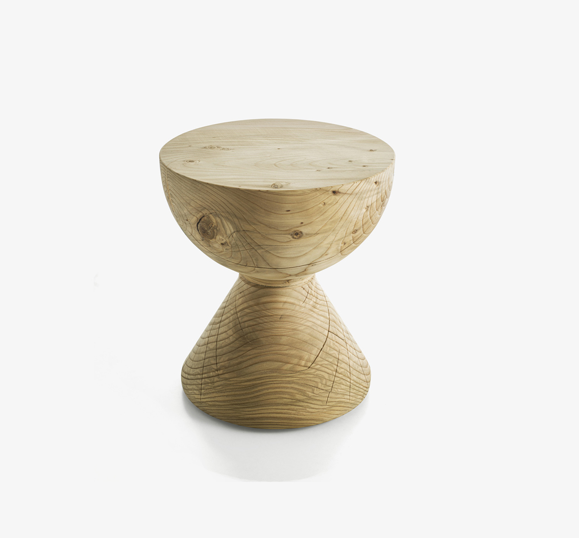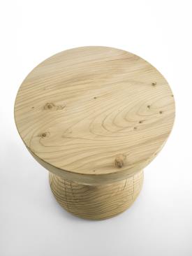 Tabouret en cèdre massif odoriférant fabriqué à partir de deux blocs assemblés entre eux, qui naît de la rencontre de lignes courbes et droites.