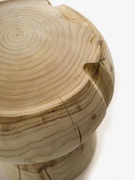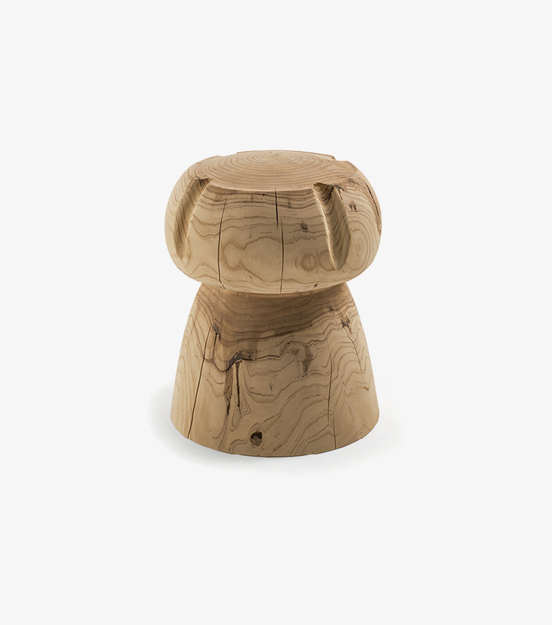 Tabouret fabriqué à partir d'un seul bloc de cèdre massif odoriférant, qui rappelle un maxi bouchon typique des bouteilles de champagne.