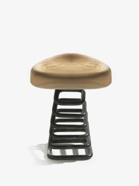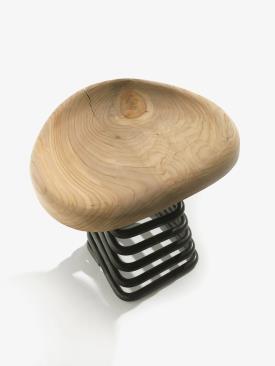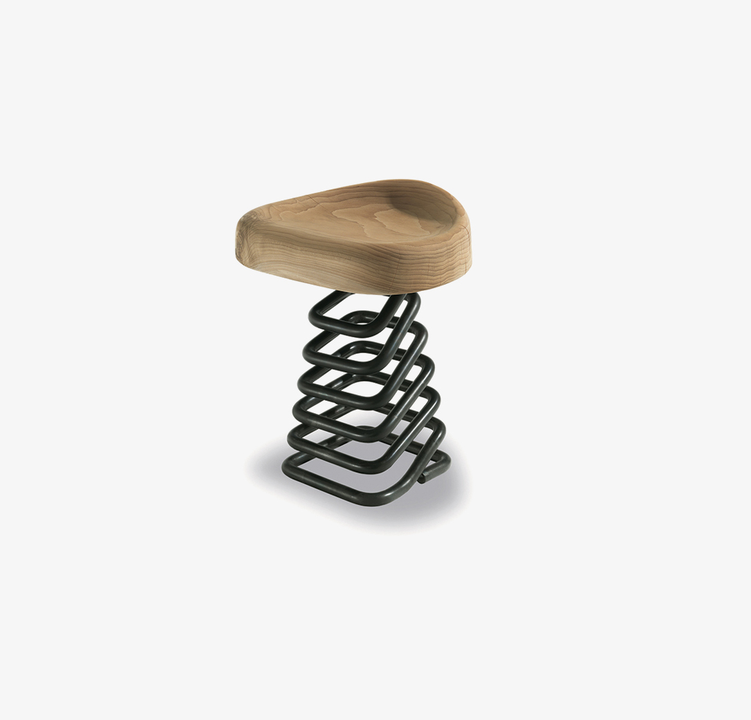 Tabouret composé d’une assise en bois massif, supporté par un ressort carré qui permet un mouvement d’oscillation dans les différentes directions.