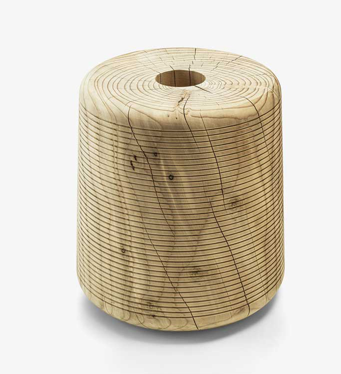 Tabouret fabriqué à partir d’un seul bloc de cèdre massif odoriférant, qui rappelle une bobine dont le traitement de surface rappelle le fil qui y est enroulé.