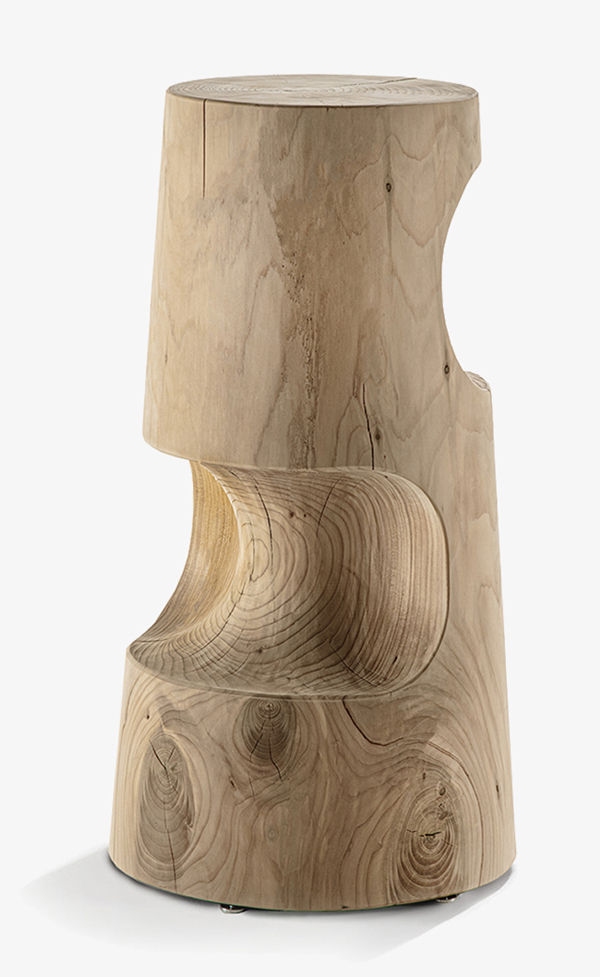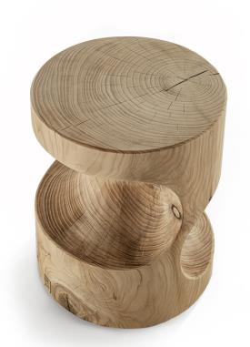 Tabouret conique fabriqué à partir d'un seul bloc de cèdre massif odoriférant, avec deux découpes sur les côtés. Dans la variante haute la découpe inférieure peut être utilisée comme repose-pieds.
