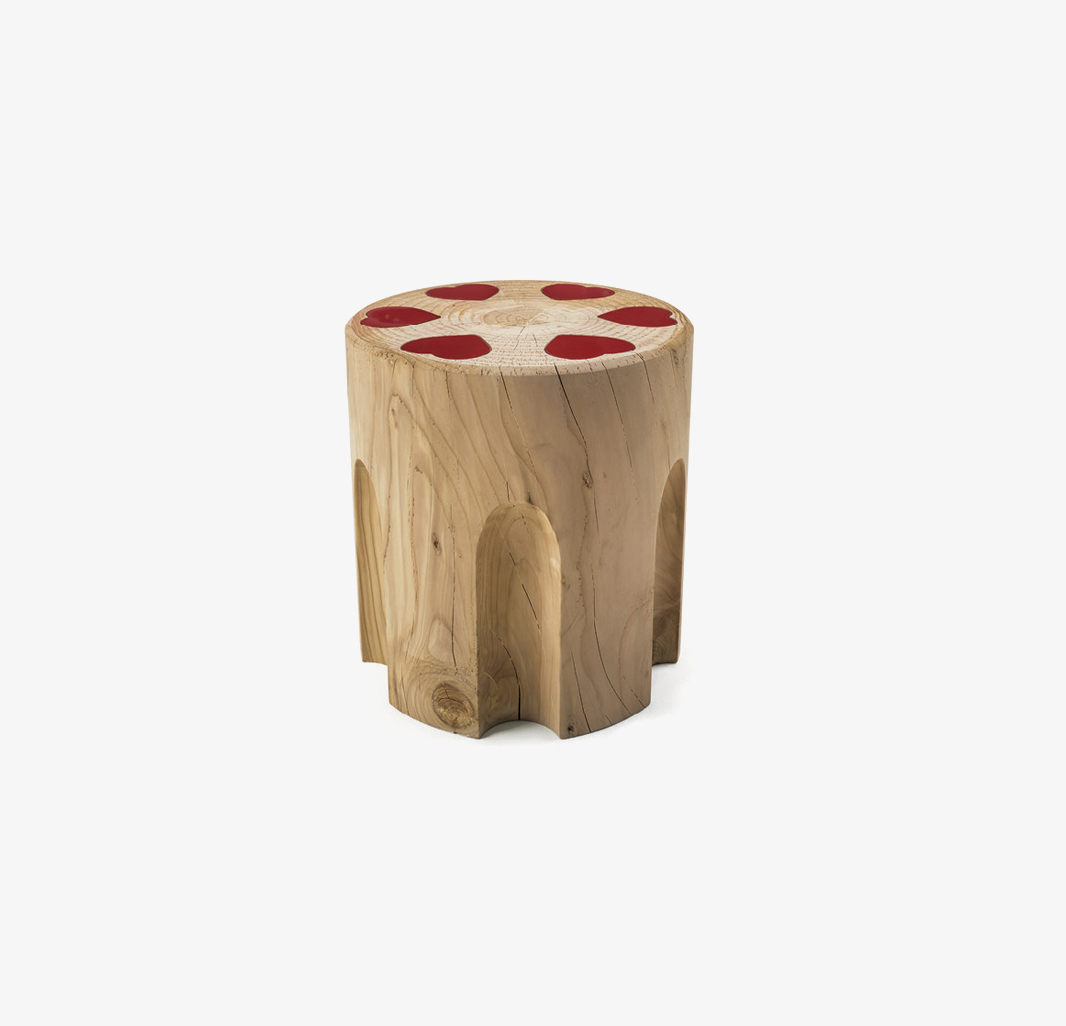 Tabouret fabriqué à partir d'un seul bloc de cèdre massif odoriférant, représentation symbolique d’un barillet de revolver qui au lieu de balles létales tire des coeurs rouges romantiques.