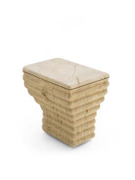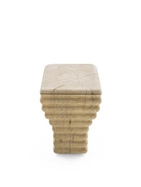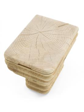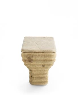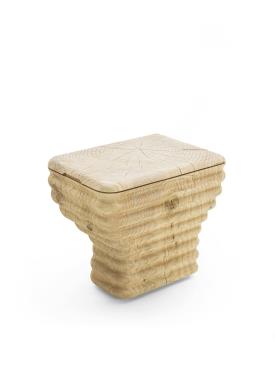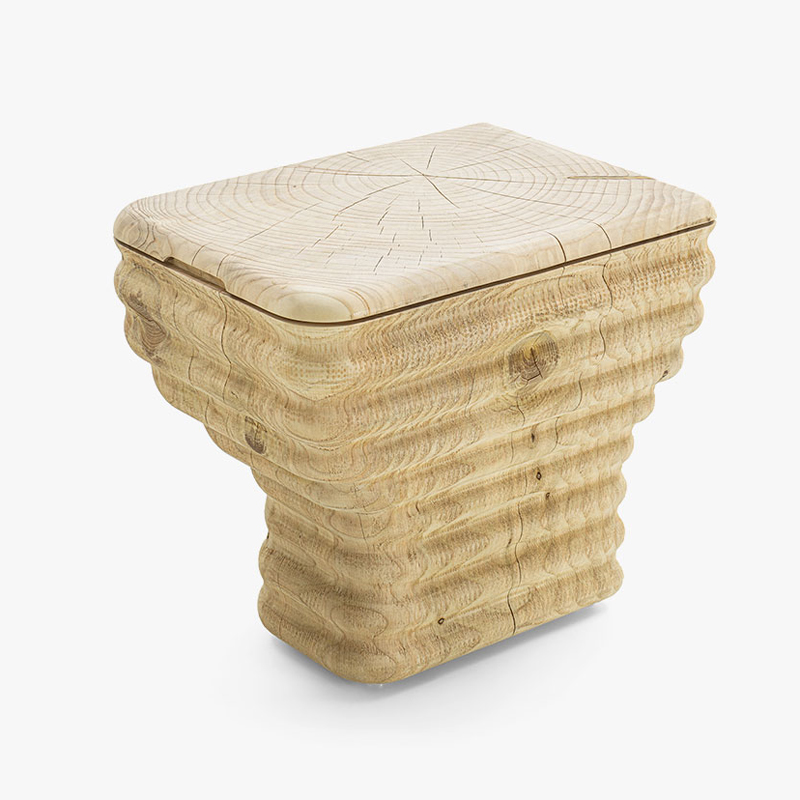 Tabouret en bois de cèdre massif odoriférant, fabriqué à partir d’un seul bloc et présentant un design original en forme de vague. L'assise est lisse, tandis que les côtés conservent une finition brute. Inspiré de la forme d'un sanitaire, il représente une réinterprétation innovante: grâce au travail du bois, il est possible d'obtenir de douces ondulations, un effet que la céramique, habituellement utilisée pour fabriquer les sanitaires, ne permet pas d'obtenir.